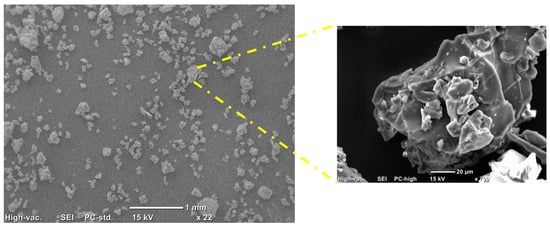 Figure 4 shows the SEM micrographs of the lignin extracted from the nutshells at two different magnifications, obtained with secondary electrons. In the micrographs, an irregular morphology in shape and size can be observed. This type of morphology is very similar to that which is obtained in soda lignin [], or the kraft lignin from the supplier Sigma Aldrich, that presents defined morphologies of rounded or hemispherical shape, according to what was reported by Kohnke []. According to the previous studies, spherical morphologies have greater thermodynamic stability than the other forms of particles []. The morphology evidenced under these treatment conditions can be explained by the milling process. The lignocellulosic liquor obtained after treatment is subjected to evaporation where a thin film is formed, which then undergoes a grinding process that could cause this type of irregular morphology in shape and size.