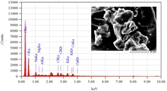 The elemental analysis obtained by EDS is presented in Figure 5. This analysis showed that lignin is mainly composed of carbon and oxygen, with small traces of chlorine, alumina, magnesium, sodium, potassium, and calcium. The presence of these elements is mainly due to traces of ash that remain in the lignin from the extraction biomass. The predominant presence of carbon and oxygen is in accordance with the structure of lignin since it presents functional groups based on carbon and carbon-carbon, carbon-oxygen, and carbon-hydrogen bonds. Lignin generally has a high carbon content that can vary between 50 and 75% by weight [], which is consistent with that which has been reported in this work, showing a carbon content of 76.5%.