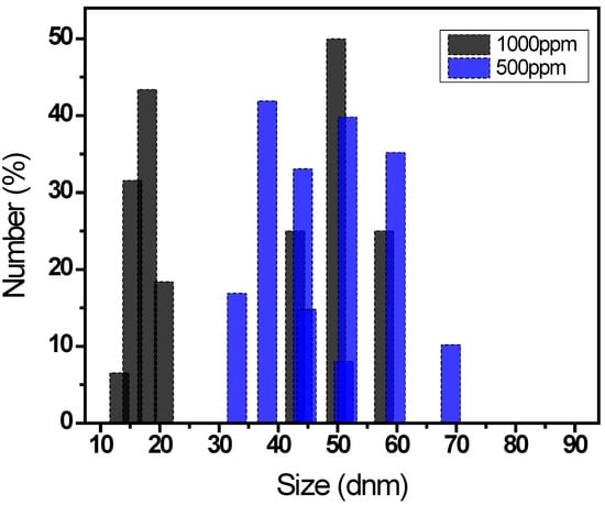Finally, regarding the characterization of the extracted lignin, Figure 6 shows the particle diameter distribution of lignin obtained by DLS, which measures fluctuations in scattering intensity as a function of time. A distribution ranging from 10 to 70 nm in particle diameter can be observed for the lignin concentrations analyzed (500 and 1000 ppm); however, both concentrations exhibit particle diameters of the same order of magnitude, with average diameters of 47 and 33 nm.