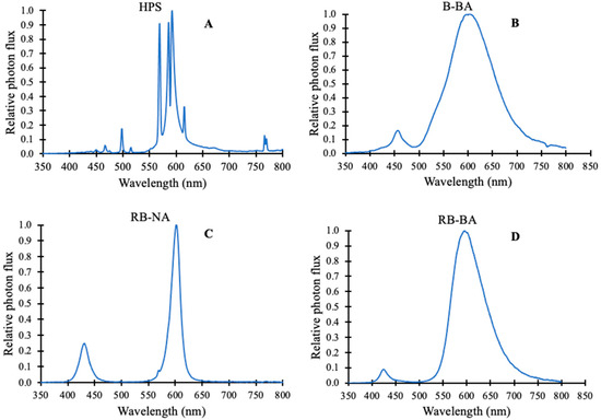 The relative spectral photosynthetic photon flux density (PPFD) of each light experimental treatment. HPS (A): single-ended high-pressure sodium; B + BA (B): blue + broad amber (455–602 nm); RB-NA (C): royal blue + narrow amber (430–602 nm); RB-BA (D): royal blue + broad amber (423–595 nm) light treatment.