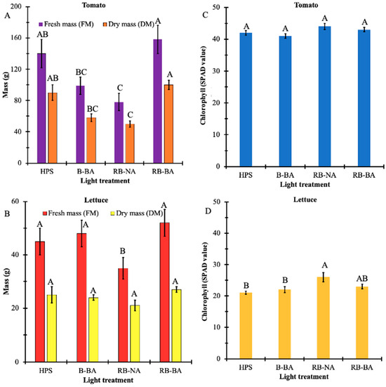 Effect of different light treatments [HPS: single-ended high-pressure sodium, B-BA: blue + broad amber (460–595 nm), RB-BA: royal blue + broad amber (430–595 nm), and RB-NA: royal blue + narrow amber (430–595 nm)] on tomato and lettuce plant growth parameters, including (A) fresh mass (FM) and dry mass (DM) for tomato plants, (B) fresh mass (FM) and dry mass (DM) for lettuce plants, (C) chlorophyll (Chl) content in leaves [SPAD value (Soil Plant Analysis Development)] for tomato plants, and (D) chlorophyll (Chl) content in leaves (SPAD value) for lettuce plants. Data represent the means of three replicates ± standard error (S.E.). Different superscript letters represent significant (p < 0.05) differences using Tukey’s post hoc test.