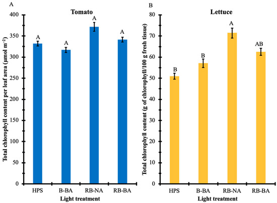 Light treatments had less impact on Chl in tomato plants than in lettuce plants, as statistical analyses showed no significant (p < 0.05) differences in Chl for tomato plants grown under the different light treatments (Figure 2C,D). Chl in tomato plants determined with the SPAD meter was highest under RB-NA (43.36 ± 1.33), followed by RB-BA (41.88 ± 0.73), HPS (41.41 ± 0.78), and B-BA (40.67 ± 0.90). The SPAD (Soil Plant Analysis Development) meter is a rapid, accurate, and non-destructive measurement of leaf chlorophyll levels in research and agricultural applications for various plants. Although non-destructive tests were not used for chlorophyll analyses, research has shown a strong correlation (R2 = 0.9) between SPAD and chlorophyll content per leaf area for monocots and dicots [29,30,31]. Statistical analyses showed the different light treatments did not have a significant (p < 0.05) effect on the accumulation of chlorophyll in tomato plants. The highest Chl in lettuce observed was under RB-NA (26.50 ± 1.36) followed by RB-BA (23.97 ± 0.67), B-BA (22.37 ± 0.99), and HPS (20.57 ± 0.42). Similar observations were made for the total chlorophyll content derived using published models (Figure 3) [29,31]. Plants treated with RB-NA had the highest total chlorophyll content for tomato (371.46 µmol m−2) and lettuce (71.41 g of chlorophyll/100 g fresh tissue).