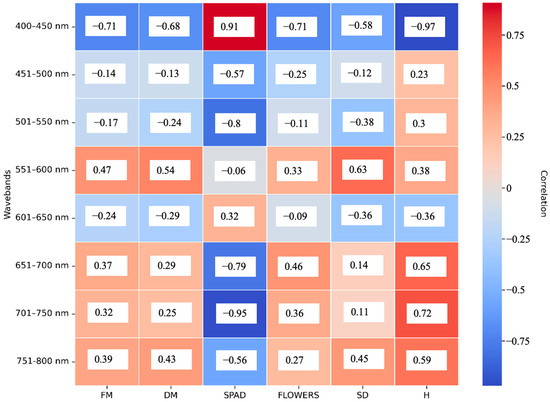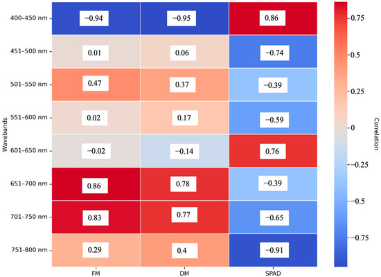 Correlation among light waveband (50 nm intervals) and growth parameters of lettuce plants, including fresh mass (FM), dry mass (DM), and chl (SPAD). The number in each cell is the correlation coefficient. The colors reflect the changes in the correlation coefficient: red represents the correlation coefficient with high and positive correlation; blue indicates high and negative correlation.