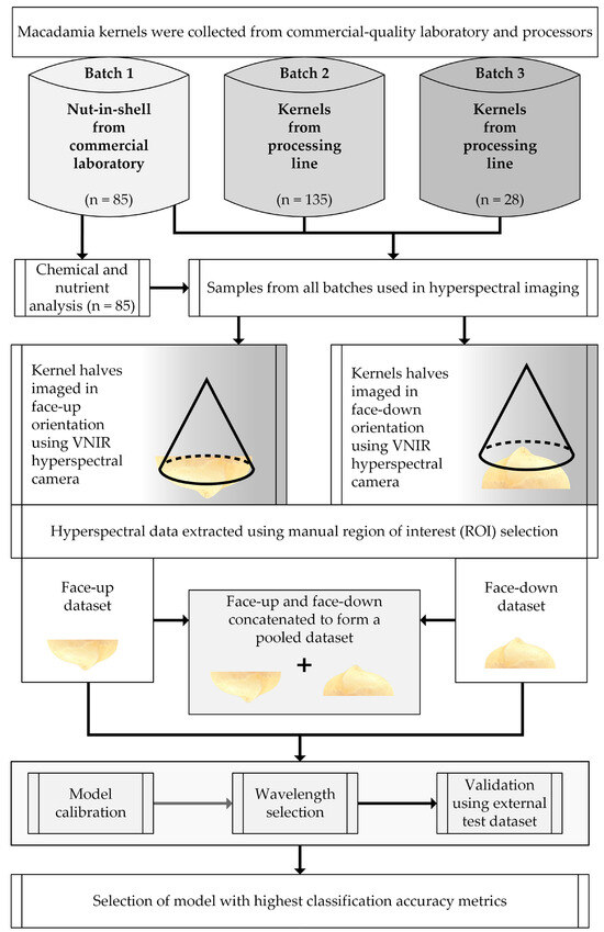 Collecting samples from different orchards and seasons can provide rich variation within a dataset and help to obtain a robust calibration model [22]. Therefore, three batches of macadamia nuts were collected over three seasons from one nut quality laboratory and two commercial processors, where samples from each batch were received from various farms with mixed cultivars to ensure wide representation of different varieties, growing conditions and handling practices (Figure 1). The first batch of samples (n = 85) were selected from 20 consignments of nut-in-shell submitted to a commercial laboratory for independent kernel quality assessment and contained both brown centers (BCs) and premium kernels (PKs) that were unaffected by quality issues. Nut-in-shell samples were dried to 1.5 ± 0.5% moisture concentration according to industry practice and manually cracked [5]. Whole kernels were cut in half using a sharp knife and classified as either brown center or premium using the Australian kernel assessment manual [5]. All samples from the first batch were used during hyperspectral imaging and chemical analysis (Figure 1). Sample preparation and chemical analysis of batch 1 are described in detail in the Supplementary Materials (Supplementary Table S1). The second batch of samples (n = 135) were selected from the processing line of a commercial processor after drying and cracking and classified as brown center or premium by qualified laboratory staff (Figure 1). These samples were used in hyperspectral imaging and classification model development only. The third batch of samples (n = 28) were collected from the processing lines of two commercial processers after drying and cracking and classified as brown center or premium by qualified laboratory staff (Figure 1). These kernels were then used in hyperspectral imaging and classification model development only. In total, 248 macadamia nuts were used in this study (Table 1).