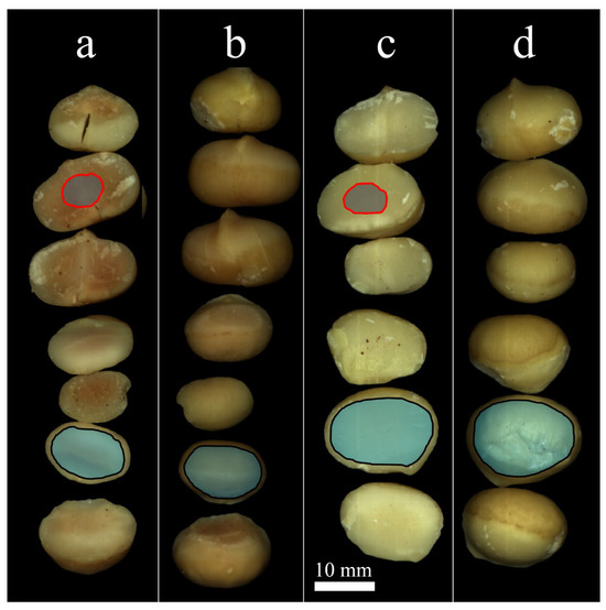Pseudo-RGB image showing macadamia kernel classes: (a) brown center imaged in face-up orientation; (b) brown center imaged face-down orientation; (c) premium kernel imaged face-up orientation; and (d) premium kernel imaged face-down orientation. The spatial region with red outline represents an example of a ≥7 mm diameter sub-sample of kernel flesh that was removed for chemical and nutrient analysis, and the spatial regions with blue shading represent an example of the manually selected regions of interest (ROIs) where mean spectral data were extracted for use in model development.