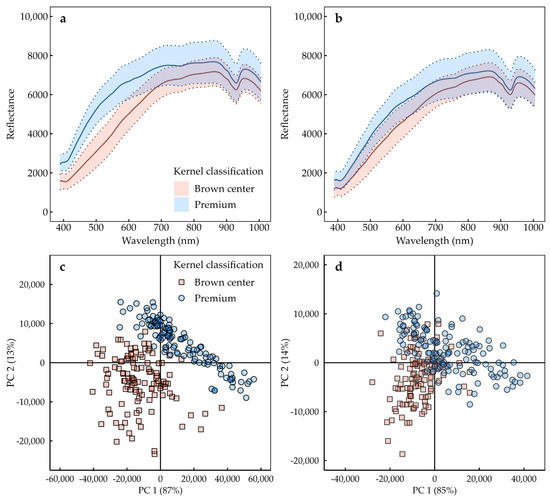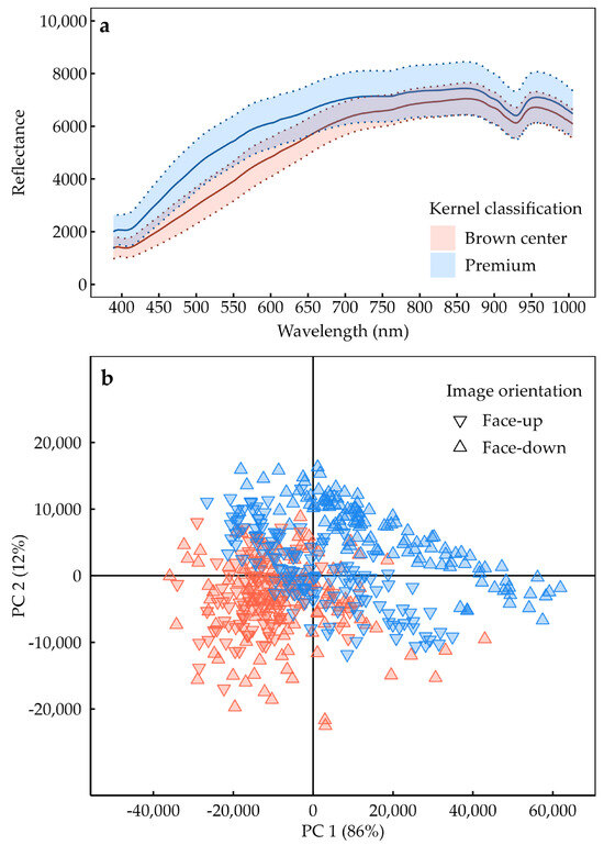 In general, macadamia kernels with brown center disorder had lower mean reflectance regardless of the image orientation used during imaging or following image concatenation to form a pooled dataset (Figure 3a,b and Figure 4a). Lower reflectance for brown center kernels was especially evident in the face-up images and in the region between 400 and 750 nm (Figure 3a). The spectral signature of brown center and premium kernels was similar above 800 nm, and the spectra extracted from both classes and both image orientations showed a distinct peak at 890 nm followed by a trough between 900 and 950 nm (Figure 3a,b). Lastly, variation in reflectance between the classes in the range 450–650 nm was increased in images taken in the face-up compared with the face-down orientation (Figure 3a,b).