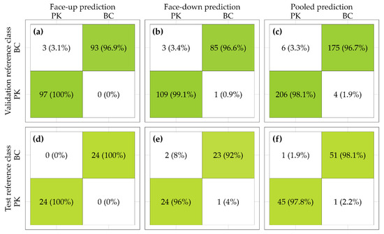 Confusion matrix showing cross-validation (a–c) in dark green and independent test (d–f) in light green classification results (recall) for the best-fit models developed using the ensemble subspace discriminant (ESD) model and all (n = 462) VNIR wavelengths extracted from images of macadamia kernels in the (a,d) face-up orientation, (b,e) face-down orientation and (c,f) pooled dataset. Classes within each matrix cell are denoted as BC: brown center and PK: premium kernel. Values represent the number of samples and (recall%).