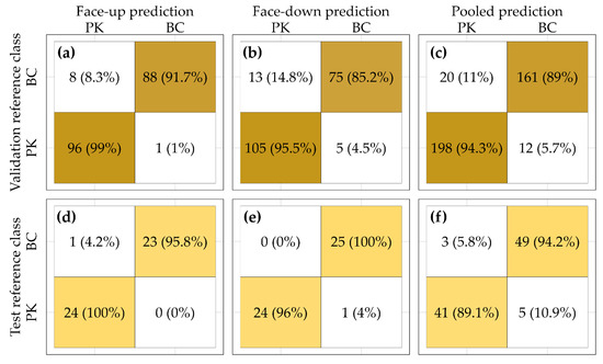 Confusion matrix showing cross-validation (a–c) in dark yellow and independent test (d–f) in light yellow classification results for the best-fit models developed using ten wavelengths selected by the MRMR algorithm and extracted from images of macadamia kernels in (a,d) face-up orientation using the linear discriminant model, (b,e) face-down orientation using the LD model and (c,f) pooled dataset using the artificial neural network (ANN) model. Classes within each matrix cell are denoted as BC: brown center and PK: premium kernel. Values represent sample number of samples and (recall%) in parentheses.