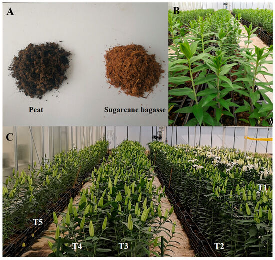 The appearance of peat and SCB, and the growth status of lilies on substrates with different SCB contents ((A) is the appearance of peat and SCB; (B) shows the seedling status of lilies on T3 substrate with 50% SCB; (C) shows the pre-flowering status of lilies on five substrates, each substrate number corresponds to a column of lilies).