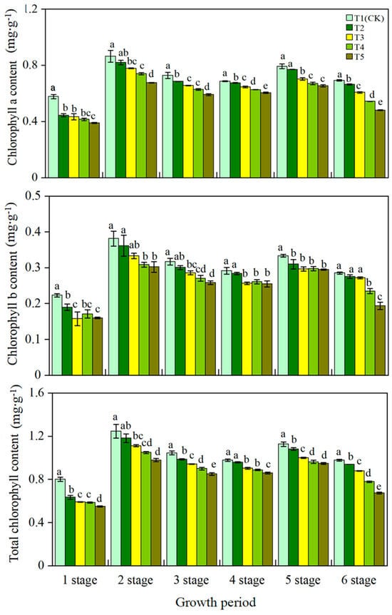 Chlorophyll is responsible for the absorption, transfer, and transformation of light energy in plants. Thus, the content of chlorophyll in the leaves is an important indicator of the photosynthetic capacity of plant leaves [25]. The contents of total chlorophyll, chlorophyll a, and chlorophyll b in the leaves of lily cultivar ‘Siberia’ varied greatly across the different substrates throughout the six growing periods, as shown in Figure 2. The contents of chlorophyll a, chlorophyll b, and total chlorophyll increased rapidly from the bud stage to the flowering stage; decreased after flowering; increased slightly at 45 days after flowering; and decreased rapidly at 60 days after flowering. This was especially evident in T4 and T5. The chlorophyll content of the leaves in the bud stage was the lowest among the six stages. Notably, however, the chlorophyll a content in T1 was 30.00%, 33.00%, 39.17%, and 48.33% higher than in T2, T3, T4, and T5, respectively. The content of chlorophyll b in T3, T4, and T5 was similar at 30 days and 45 days after anthesis, but the content of chlorophyll a in the three substrates was significantly different (p < 0.05). This indicates that the total chlorophyll content was more affected by chlorophyll a. At 60 days after flowering, the contents of chlorophyll a and b, and total chlorophyll in T5 decreased by 30.60%, 32.03%, and 31.02% compared to T1, respectively. The difference in chlorophyll content across the six growth stages and the five substrates indicates that the addition of SCB in different proportions reduces chlorophyll content to different degrees.
