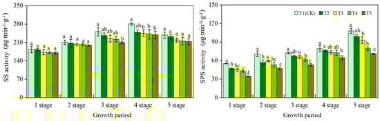 From the flowering stage to 60 days after anthesis, the SS activity in the five treatments showed a trend of first increasing and then decreasing (Figure 3), reaching maximum activity at 45 days after anthesis. At this time, SS activity increased by 52.6%, 36.5%, 41.7%, 41.1%, and 40.2%, respectively, compared to the flowering stage of the T1–T5 treatments. From 45 to 60 days after anthesis, the activity of SS decreased. The activity of SS at 60 days after anthesis was roughly the same as that at 30 days after anthesis. The SS activity in T1 was higher than in the other four treatments during the five periods from the flowering stage to 60 days after anthesis. In particular, at 45 days after anthesis, the SS activity in T1 was significantly higher than in T5 by 17.4%. The activities of SPS and SS showed different trends. Across the five substrate treatments, the activity of SPS rose from the beginning of flowering to 60 days after anthesis, reaching its maximum at this time. At this stage, the SPS activity across the T1-T5 treatments increased by 96.7%, 111.0%, 107.0%, 83.1%, and 108.3% compared to the flowering period, respectively. At 15–45 days after flowering, there were no significant differences in the activity of SPS between T2, T3, and T4.