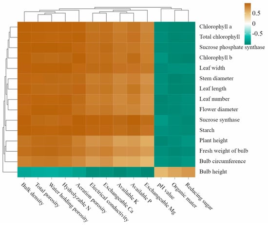 The results show that the contents of chlorophyll a and b and total chlorophyll in the leaves of ‘Siberian’ lilies had the same correlation performance with the physicochemical properties of the substrates. Except for the significantly negative correlation with the pH, the organic matter and reducing sugar content of the substrates, the contents of chlorophyll a and b and total chlorophyll also had significant positive correlation with bulk density, total porosity, water-holding porosity, ventilation porosity, EC value, hydrolyzed N, available P, and exchange Ca content of substrates (p < 0.05). The plant height, stem diameter, leaf number, leaf length and width, flower diameter of cut flowers, fresh weight, starch content, and the activities of SS and SPS of the bulbs were also significantly negative correlated with pH, organic matter, and reducing sugar content of the substrate, and significantly positively correlated with bulk density, total porosity, water-holding porosity, and hydrolyzed N content of the substrate (p < 0.05) (Table 6). The bulb circumference was significantly positively correlated with the water-holding porosity of the substrates, while the correlation between the bulb height and the physicochemical properties of the substrates was completely opposite to the other quality indicators of bulbs (p < 0.05) (Figure 4).