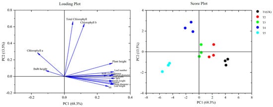 The results of the principal component analysis show that the cumulative contribution rate of the first two components reached 81.8%, representing most of the information in the original data (Figure 5). In the loading plot, the contribution rate of the first principal component (PC1) was 68.3%, of which the stem diameter load was 0.303, leaf number load was 0.301, flower diameter load was 0.304, and SPS load was 0.306, accounting for the highest proportion. The contribution rate of the second principal component (PC2) was 13.5%, of which the chlorophyll a load was 0.286, chlorophyll b load was 0.635, and total chlorophyll load was 0.663, accounting for the highest proportion. In conclusion, the stem diameter, leaf number, flower diameter, SPS activity, chlorophyll a and b, and total chlorophyll were extracted as the core indexes for evaluating the suitability of cultivated substrate for cut lily flowers. In the score plot, the location features of the samples at T2 and T3 are similar, and they are closer to T1, indicating that the principal component features of the samples at T2 and T3 were similar to those at T1.
