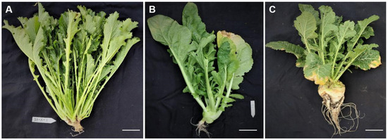 Figure 1. Different mustard cultivars used in this study. (A) ‘Lion Head’; (B) ‘Yong An Xiao Ye’; (C) ‘Hua 501’. Bar = 5 cm.