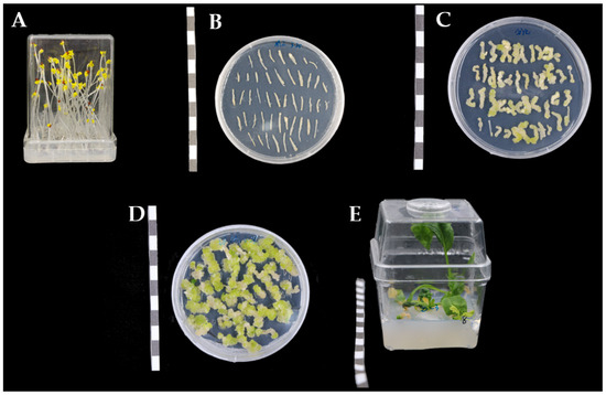 Figure 2. Diagram of the genetic transformation process in root mustard. (A) Sterile seedling culture stage; (B) co-culture stage; (C) callus induction stage; (D) adventitious bud differentiation stage; (E) regeneration stage. Bar = 1 cm.
