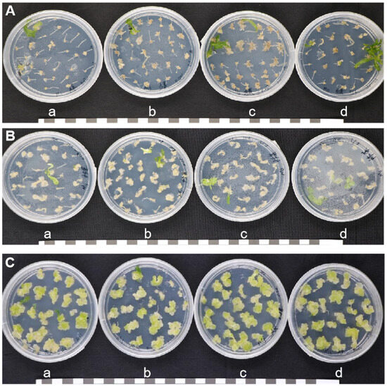 The callus tissue of the root mustard variety ‘Hua 501’ had a compact texture and a pale green color (Figure 3C), while that of the leaf mustard variety ‘Lion Head’ and stem mustard variety ‘Yong An Xiao Ye’ was thin with a delicate texture and faint yellow color, and that of the leaf mustard variety ‘Lion Head’ was easier to brown (Figure 3A,B).