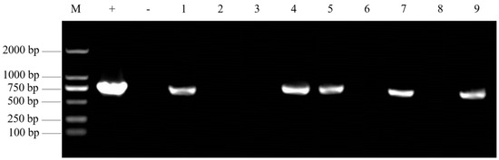 Figure 4. PCR detection of transgenic plants in Brassica juncea. M. DL2000 marker; +. Positive control (recombinant plasmid); −. Negative control (untransformed mustard plant); 1–9. In the transgenic regenerated plants of mustard, the size of kana resistance gene products was 720 bp.