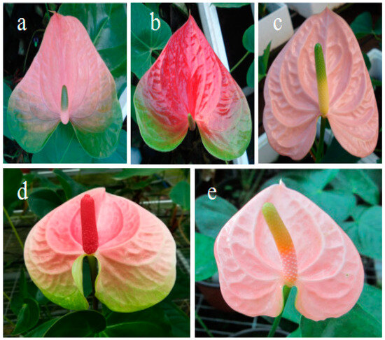 The spathe and spadix of the five A. andraeanum cultivars investigated in this study. (a) A. andraeanum ‘Baron’; (b) A. andraeanum ‘Spice’; (c) A. andraeanum ‘Cheers’; (d) A. andraeanum hybrid 1; (e) A. andraeanum hybrid 2.