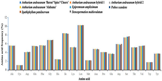 Amino acid frequency among the Araceae chloroplast genomes. The X-axis shows amino acids, whereas the Y-axis shows the amino acid frequency as a percentage.
