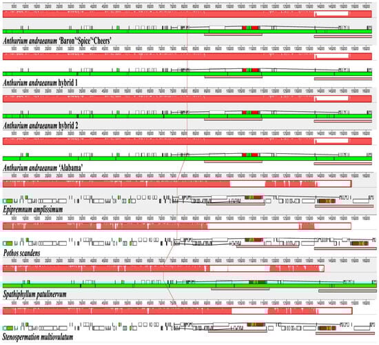 The arrangement of genes in A. andraeanum ‘Baron’, A. andraeanum ‘Spice’, A. andraeanum hybrid 1, and A. andraeanum hybrid 2 was similar; it did not feature gene rearrangement and inversion. The gene arrangement was found to be structurally identical to A. andraeanum ‘Alabama’, as shown in the colinear block of the Mauve alignment. The arrangement of genes did not change due to expansions of the SSC region, and A. andraeanum hybrid 1 had two InDel special marker site inserted in the LSC non-coding region, but it did not affect the gene arrangement. However, the genes in the LSC, SSC, and IR regions in Pothos scandens chloroplasts varied in their arrangement. The genes in the LSC and IR region were relatively long. The arrangement of genes in the SSC region in Pothos scandens chloroplasts changed due to the expansion of the LSC and IR region (Figure 4).