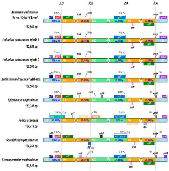 Comparison of the borders of large single-copy (LSC), small single-copy (SSC), and inverted-repeat (IR) regions among the Araceae chloroplast genomes.