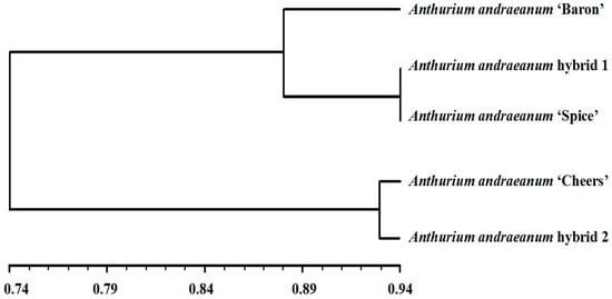 UPGMA clustering analysis of the five A. andraeanum cultivars based on ISSR markers.