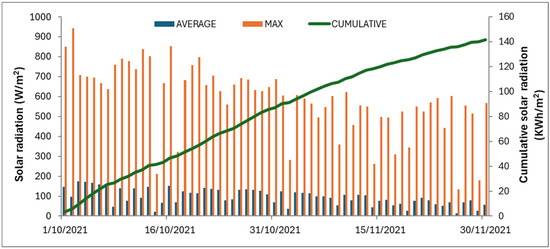 Average, maximum and cumulative daily solar radiation in the field from the date of transplanting (1 October 2021) to the date of harvest.