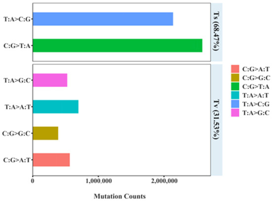 Spectrum analysis of SNP mutation. Ts: The number of transitions, the substitution between purines and purines, or between pyrimidines and pyrimidines; Tv: The number of transversions, the substitution between purines and pyrimidines.