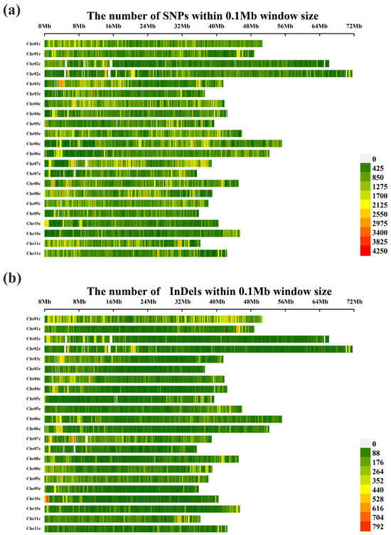 Genome-wide variant calling. (a) Distribution of SNPs on chromosomes. (b) Distribution of InDels on chromosomes. “Chr” means chromosome.