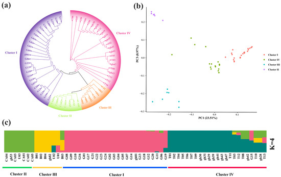 Population analysis of C. arabica. (a) Phylogenetic tree of 61 C. arabica. Different colors mean different groups. (b) Principal component analysis (PCA). Different colors mean different groups. (c) Population structure analysis. The K value was set to 4. Different colors above the sample names mean different ancestral components and different colors below the sample names mean different groups.