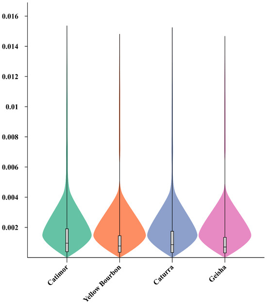 To further understand the genetic diversity of the Catimor, Caturra, Yellow Bourbon, and Geisha populations, the genetic diversity metrics for the four Arabica coffee varieties were calculated, including observed heterozygosity, expected heterozygosity, and nucleotide diversity (Pi). A total of 22 Catimor, 22 Geisha, 3 Yellow Bourbon, and 6 Caturra accessions were included in the calculations (Table S1). The results for each experimental population are shown in Table 1. Across all populations, Geisha had the lowest observed heterozygosity and expected heterozygosity, while Caturra had the second-lowest observed heterozygosity and expected heterozygosity. The Catimor population had the highest observed heterozygosity and expected heterozygosity. The ranking of observed heterozygosity (Obs_Het) was Catimor > Yellow Bourbon > Caturra > Geisha and the ranking of expected heterozygosity (Exp_Het) was Catimor > Yellow Bourbon> Caturra > Geisha. For the four populations, Geisha had the lowest Pi value, Caturra had the second-lowest Pi value, and Catimor had the highest Pi value (Table 1, Figure 4).
