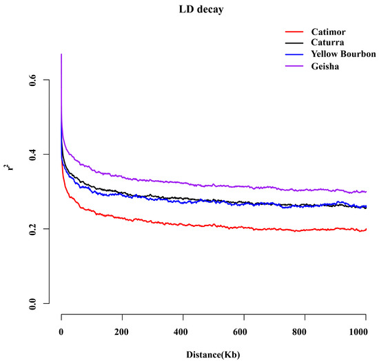 The linkage disequilibrium (LD) decay analysis performed on the four coffee varieties within the sample set (Figure 5) revealed distinctive patterns that shed light on the genetic structure and evolutionary history of these Arabica coffee populations. The results indicated that among all the Arabica coffee populations, Catimor exhibited the lowest LD level and the fastest decay rate. Conversely, Geisha showed a higher LD level and the slowest decay rate. These LD analysis results were consistent with the analysis result of genetic diversity. Interestingly, Yellow Bourbon and Caturra exhibited similar LD decay rates, which may be due to their shared ancestral lineage (Figure 5). Both of them are derived from mutations in Bourbon. Additionally, the phylogenetic tree also showed that they had a closer genetic relationship (Figure 3a).
