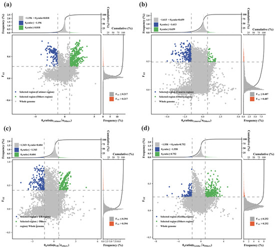 Selection sweep analysis. (a) FST and θπ ratio selective elimination analysis of Catimor. (b) FST and θπ ratio selective elimination analysis of Caturra. (c) FST and θπ ratio selective elimination analysis of Yellow Bourbon. (d) FST and θπ ratio selective elimination analysis of Geisha. The abscissa is the θπ ratio value, and the ordinate is the FST value, corresponding to the frequency distribution diagram above and the frequency distribution diagram on the right. The dot diagram in the middle represents the corresponding FST and θπ ratio values in different windows. The blue and green areas are the top 5% selected by θπ and FST. YB: Yellow Bourbon.