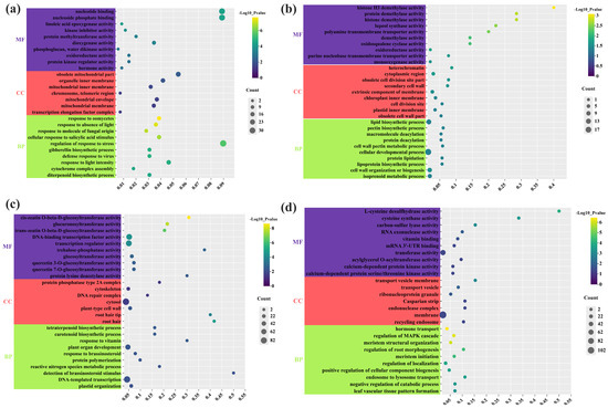 GO classification of the selected genes. (a) GO classification of the selected genes of Catimor. (b) GO classification of the selected genes of Caturra. (c) GO classification of the selected genes of Yellow Bourbon. (d) GO classification of the selected genes of Geisha. MF: molecular function; CC: cellular component; BP: biological process. The horizontal coordinates represent the gene ratio. The size of the circle represents the number of genes. Different colors represent the values of the −log10(p value).