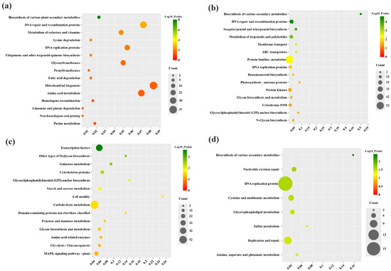 KEGG enrichment of the selected genes. (a) KEGG enrichment of the selected genes of Catimor. (b) KEGG enrichment of the selected genes of Caturra. (c) KEGG enrichment of the selected genes of Yellow Bourbon. (d) KEGG enrichment of the selected genes of Geisha. The horizontal coordinates represent the gene ratio. The size of the circle represents the number of genes. Different colors represent the values of the −log10(p value).