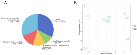 (A) Metabolite classification map identified from Pleioblastus amarus; (B) OPLS-DA score plot of metabolome data for three growth stages. BT1: shoot height at 10 cm; BT2: shoot height at 20 cm; BT3: shoot height at 40 cm.