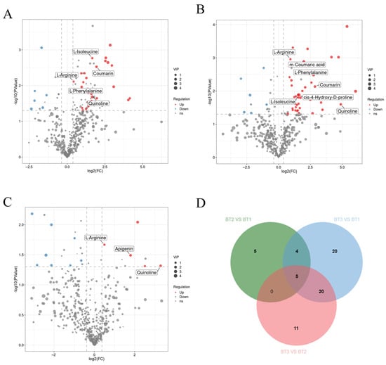 Volcano plots and Venn diagram of differentially accumulated metabolites between the three growth stages of Pleioblastus amarus shoots. (A) BT2 vs. BT1; (B) BT3 vs. BT1; (C) BT3 vs. BT2; (D) Venn diagram of the three comparison groups. BT1: shoot height at 10 cm; BT2: shoot height at 20 cm; BT3: shoot height at 40 cm.