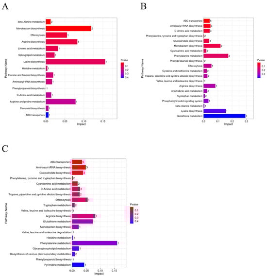 Differential accumulated metabolites analysis: Orthogonal partial least squares discriminant analysis (OPLS-DA) was conducted on the sample data utilizing the R (v4.4.0) package “ropls” (v1.36.0). The variable importances in projection (VIP) scores were calculated based on p-values, and fold change values were determined to evaluate the differences between groups. The criteria for selecting differential accumulated metabolites (DAMs) included a fold change greater than 1.2 or less than 0.83, a p-value less than 0.05, and a VIP score greater than 1. For pathway analysis, the R package MetaboAnalyst 4.0 was used to perform functional pathway enrichment analysis of the identified differential metabolites.