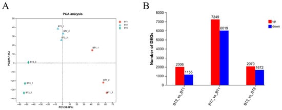 (A) PCA analysis of transcriptomic data from Pleioblastus amarus shoots; (B) bar chart of differentially expressed genes in three comparative groups. BT1: shoot height at 10 cm; BT2: shoot height at 20 cm; BT3: shoot height at 40 cm.