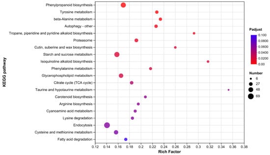 The comparison between the BT3 and BT1 stages revealed the highest number of DEGs, suggesting significant transcriptional alterations from the first to the third stage. Consequently, the BT3 vs. BT1 comparison was selected for further KEGG enrichment analysis of upregulated DEGs. The top 20 KEGG pathways with the lowest adjusted p values (Padjust), indicating the highest significance, were chosen for the construction of enrichment bubble plots. The results presented in Figure 5 demonstrated that the most significantly enriched pathways among the upregulated DEGs in the BT3 vs. BT1 comparison included phenylpropanoid biosynthesis, tyrosine metabolism, beta-alanine metabolism, isoquinoline alkaloid biosynthesis, phenylalanine metabolism, and starch and sucrose metabolism. Additionally, pathways associated with bitterness, such as arginine biosynthesis, lysine degradation, and cysteine and methionine metabolism, were also identified.