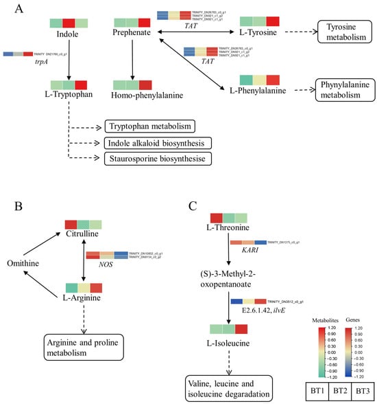 Heatmaps of co-enriched metabolites and genes: (A) phenylalanine, tyrosine, and tryptophan biosynthesis pathways; (B) arginine biosynthesis pathway; (C) valine, leucine, and isoleucine biosynthesis pathway. trpA: tryptophan synthase alpha chain; TAT: tyrosine aminotransferase; NOS: nitric oxide synthase; KARI: ketol-acid reductoisomerase; ilvE: branched-chain amino acid aminotransferase. BT1: shoot height at 10 cm; BT2: shoot height at 20 cm; BT3: shoot height at 40 cm. Solid lines with unidirectional arrows represent irreversible reaction processes, while bidirectional arrows indicate reversible reactions. Dashed arrows point to other metabolic pathways.