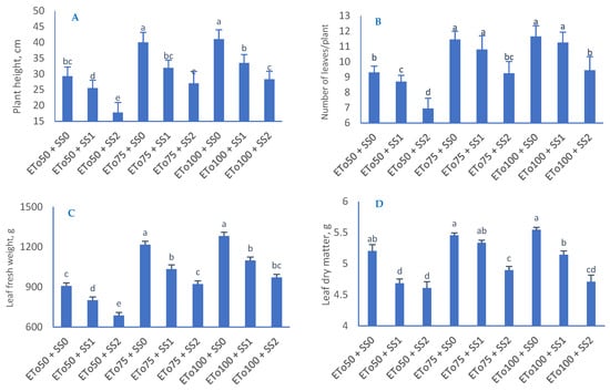 Results of the two-way ANOVA showing the combined impact of salinity and drought stresses on plant growth parameters: plant height (A); number of leaves/plant (B); leaf fresh weight (C); and leaf dry matter (D) of lettuce plants. Treatments ETo50, ETo75, and ETo100 represent 50%, 75%, and 100% of evapotranspiration as drought stress, while SS0, SS1, and SS2 represent 0, 1500, and 3000 ppm of NaCl as salinity stress. Different letter(s) indicate significant variations between the applied treatments (p ≤ 0.05).