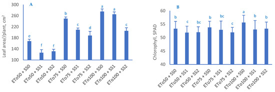 Results of the two-way ANOVA showing that the combined impact of salinity and drought stresses on leaf area (A) and chlorophyll contents (B) of lettuce plant treatments (ETo50, ETo75, and ETo100) represent 50%, 75%, and 100% of evapotranspiration as drought stress, while SS0, SS1, and SS2 represent 0, 1500, and 3000 ppm of NaCl as salinity stress. Different letter(s) indicate significant variations between the applied treatments (p ≤ 0.05).