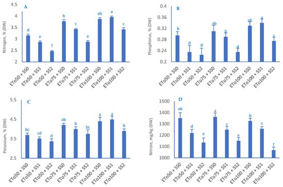 Results of the two-way ANOVA showing the combined impact of salinity and drought stresses on nitrogen (A), phosphorus (B), potassium (C), and nitrate contents (D) of lettuce plants on dry weight basis (DW). Treatments ETo50, ETo75, and ETo100 represent 50%, 75%, and 100% of evapotranspiration as drought stress, while SS0, SS1, and SS2 represent 0, 1500, and 3000 ppm of NaCl as salinity stress. Different letter(s) indicate significant variations between the applied treatments (p ≤ 0.05).
