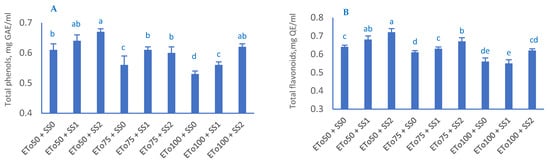 Results of the two-way ANOVA showing the total phenolics (A) and flavonoid (B) contents of lettuce plants cultivated under drought and salinity stress combined. Treatments ETo50, ETo75, and ETo100 represent 50%, 75%, and 100% of evapotranspiration as drought stress, while SS0, SS1, and SS2 represent 0, 1500, and 3000 ppm of NaCl as salinity stress. Different letter(s) indicate significant variations between the applied treatments (p ≤ 0.05).