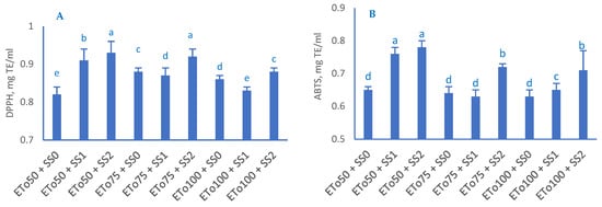 Results of the two-way ANOVA showing activities of DPPH (A) and ABTS (B) of lettuce plants cultivated under drought and salinity stresses combined. Treatments ETo50, ETo75, and ETo100 represent 50%, 75%, and 100% of evapotranspiration as drought stress, while SS0, SS1, and SS2 represent 0, 1500, and 3000 ppm of NaCl as salinity stress. Different letter(s) indicate significant variations between the applied treatments (p ≤ 0.05).