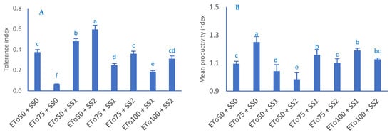 Results of the two-way ANOVA showing the Tolerance Index (A) and Mean Productivity Index (B) of lettuce plants cultivated under drought and salinity stress combined. Treatments ETo50, ETo75, and ETo100 represent 50%, 75%, and 100% of evapotranspiration as drought stress, while SS0, SS1, and SS2 represent 0, 1500, and 3000 ppm of NaCl as salinity stress. Different letter(s) indicate significant variations between the applied treatments (p ≤ 0.05).