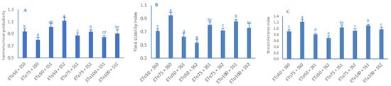 Results of the two-way ANOVA showing Harmonic Mean Productivity (A), Yield Stability Index (B), and Stress Tolerance Index (C) of lettuce plants cultivated under the combined effect of drought and salinity stress. Treatments ETo50, ETo75, and ETo100 represent 50%, 75%, and 100% of evapotranspiration as drought stress, while SS0, SS1, and SS2 represent 0, 1500, and 3000 ppm of NaCl as salinity stress. Different letter(s) indicate significant variations between the applied treatments (p ≤ 0.05).