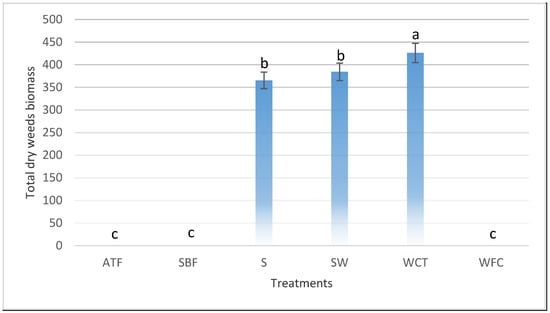 Total dry weed biomass (TDWB; g m−2) in the first experimental season. Letters on bars (a–c) refer to the statistical evaluation of the sum of the dry weed biomass illustrated by stacked bars in the diagram (p < 0.05 Duncan’s test). Synthetic mulches: ATF—agrotextile foil; SBF—silver–brown foil. Organic mulches: S—straw; SW—sawdust. Controls: WCT—weeded control; WFC—weed-free control.