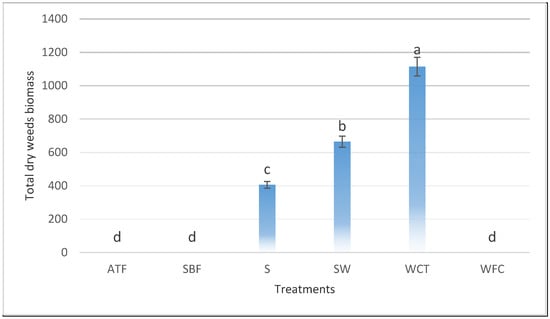Total dry weed biomass (TDWB; g m−2) in the second experimental season. Letters on bars (a–d) refer to the statistical evaluation of the sum of the dry weed biomass illustrated by stacked bars in the diagram (p < 0.05 Duncan’s test). Synthetic mulches: ATF—agrotextile foil; SBF—silver–brown foil. Organic mulches: S—straw; SW—sawdust. Controls: WCT—weeded control; WFC—weed-free control.